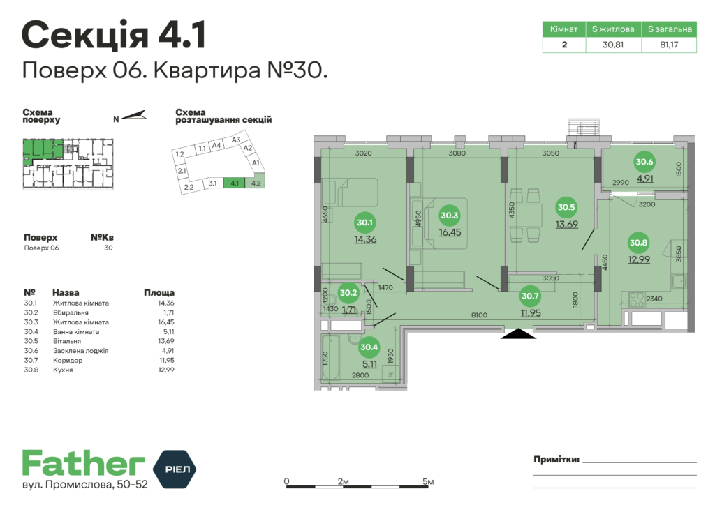 Планування 2-кімнатної квартири: №30, 81.17 м²