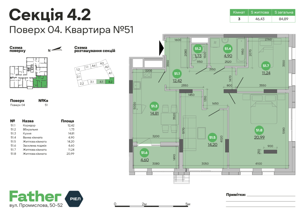 Планування 3-кімнатної квартири: №51, 84.89 м²