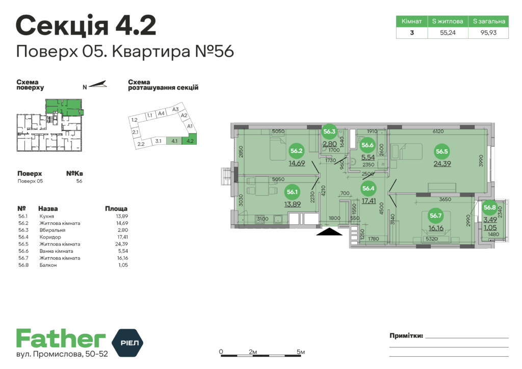 Планування 3-кімнатної квартири: №56, 95.93 м²