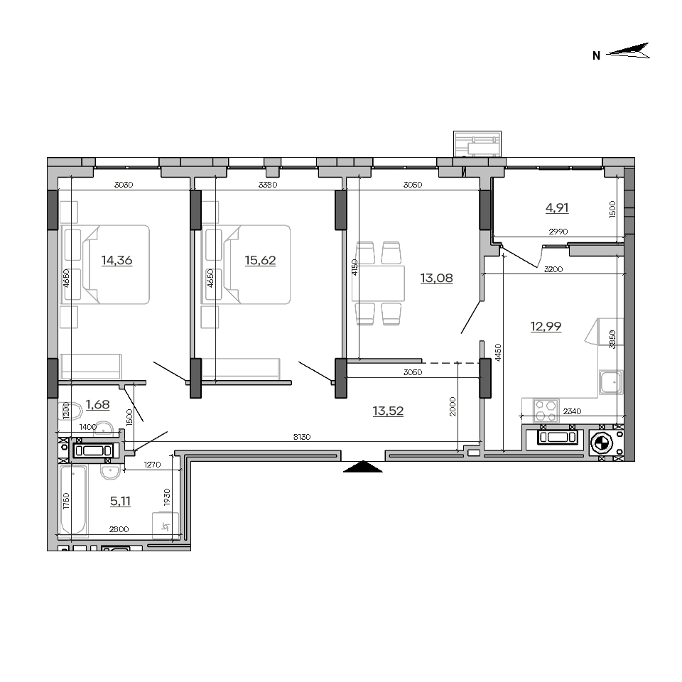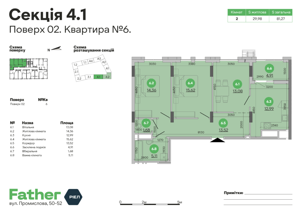 Планування 2-кімнатної квартири: №6, 81.27 м²
